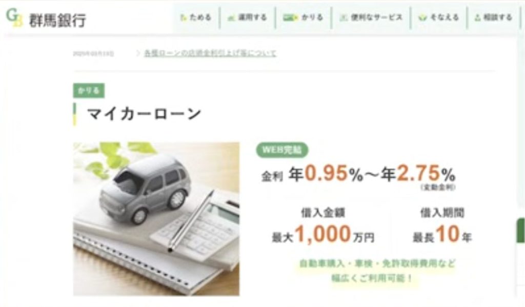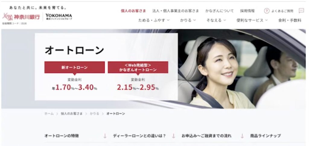 千葉銀行と同じ最安金利ですが、上限金利が2.8%のため第1位に選ばれました。営業エリアは神奈川県全域と東京・群馬の一部で利用可能です。全国対応ではありませんが、利用可能エリアの方にとっては最もお得なマイカーローンと言えます。