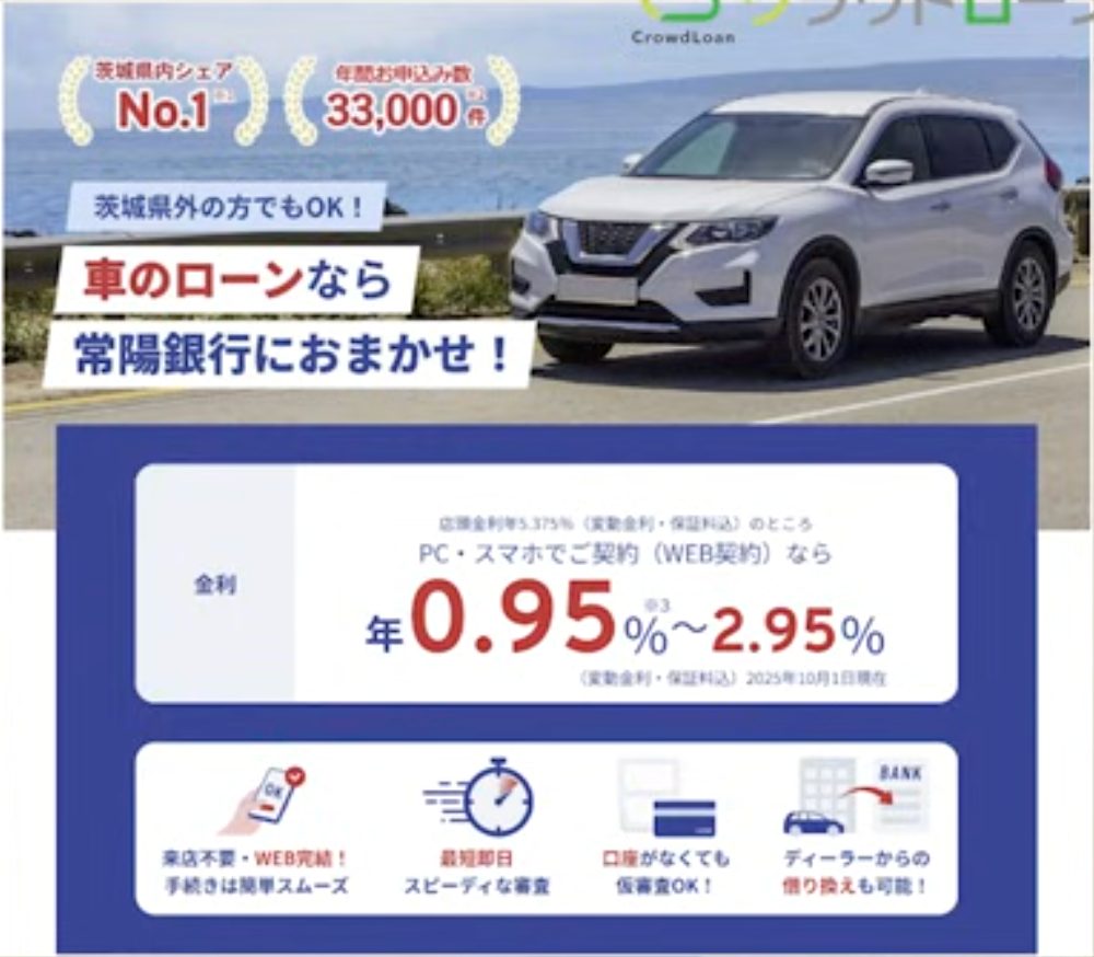 茨城県内でシェアNo.1の銀行です。茨城県は車の保有率が高いこともあり、多くの方が利用しているマイカーローンです。利用可能エリアは東京23区・千葉・埼玉・福島・宮城県仙台市と広域に渡ります。